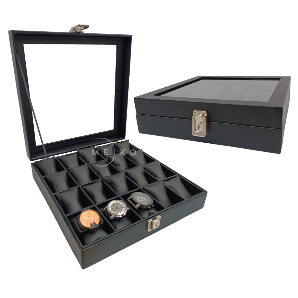 Caja relojera organizadora de 20 puestos con cajón. Un regalo perfecto y un accesorio necesario para los amantes de los relojes. Puedes organizarlos y llevarlos de viaje o simplemente para protegerlos en casa. Puedes guardar también manillas o joyas lujosas retirando las almohadillas.