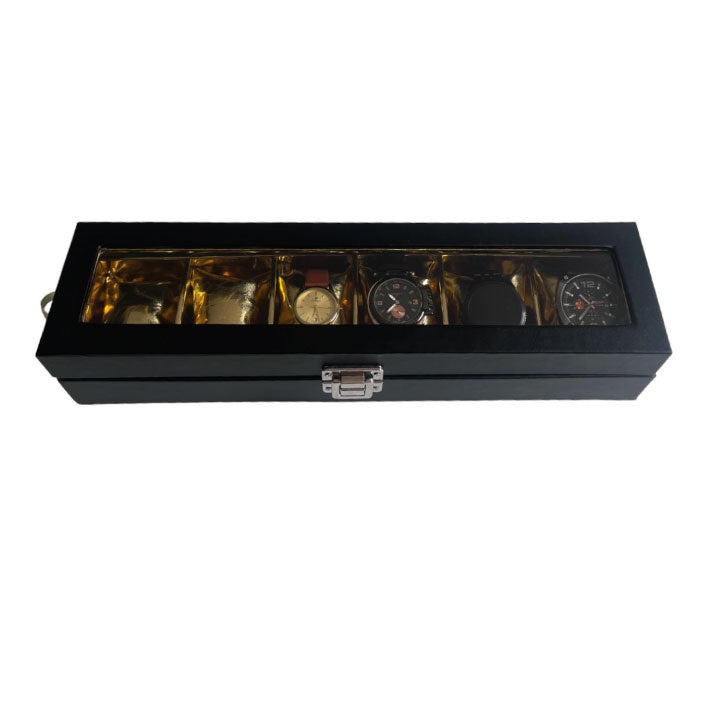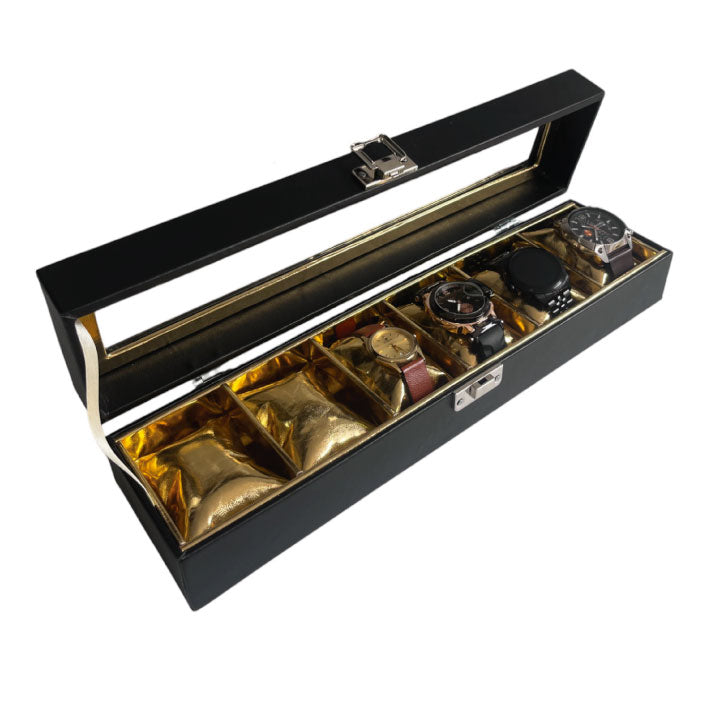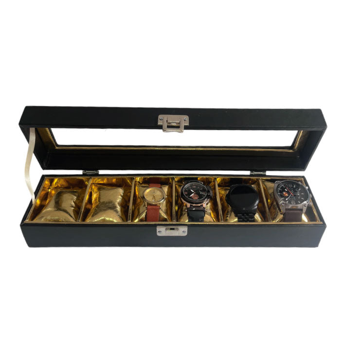 Caja relojera por 6 puestos de lujo. Un regalo perfecto y un accesorio necesario para los amantes de los relojes. Puedes organizarlos y llevarlos de viaje o simplemente para protegerlos en casa. Puedes guardar también manillas o joyas lujosas retirando las almohadillas.