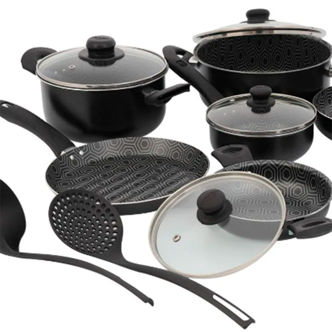 1 olla de 24 cm de ancho, 1 olla de 20 cm de ancho, 1 perol de 16 cm de ancho, 1 plancha asadora de 23 cm de ancho una cacerola de 18 cm de ancho, 1 cacerola con asas de 16 cm, 1 cucharon y una pala aliada