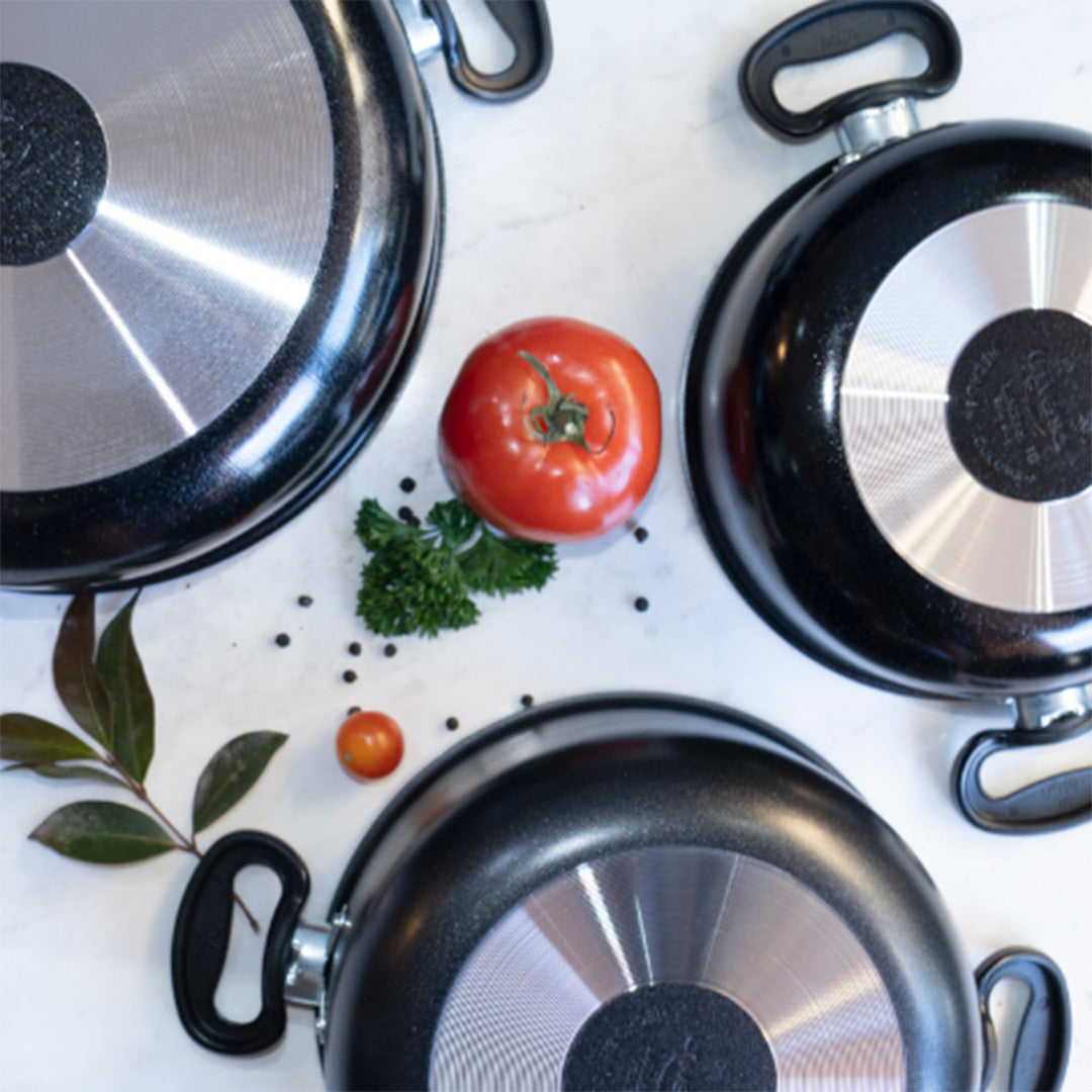 Descubre la excelencia culinaria con nuestra Batería de Ollas UNIVERSAL Aliada de 6 Piezas, diseñada con una base antiadherente que permite una cocción saludable y baja en grasa. Sus características distintivas incluyen un fondo grafilado para mayor estabilidad y distribución eficiente del calor en la base. El mango ergonómico de baquelita se mantiene fresco al tacto, mientras que la pintura exterior metalizada y las tapas de vidrio refractario añaden un toque de elegancia. ¡Hazte con la tuya ahora y transforma tu experiencia culinaria!
