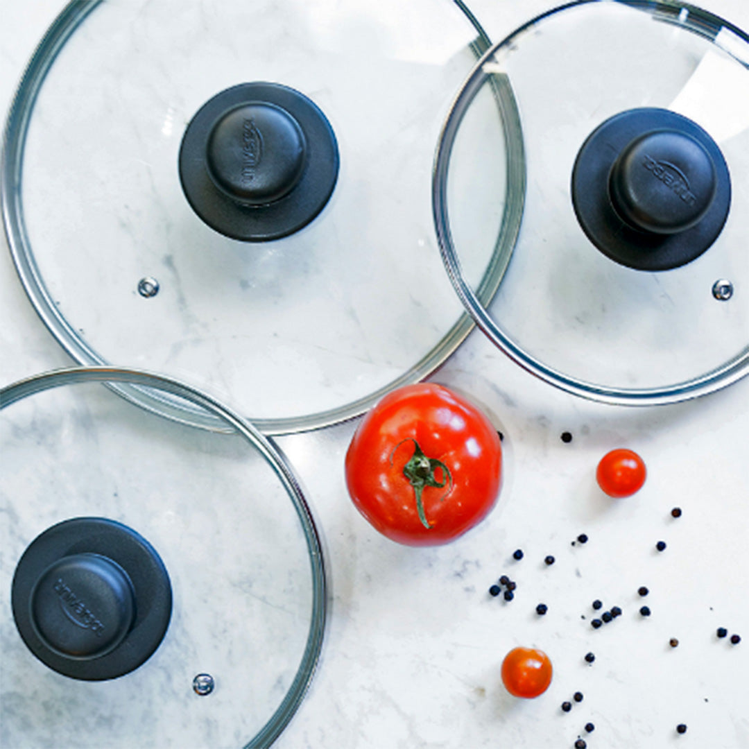 Incluye: Una olla de 24 cm con tapa de vidrio. Una olla de 20 cm con tapa de vidrio. Una olla de 18 cm con tapa de vidrio.