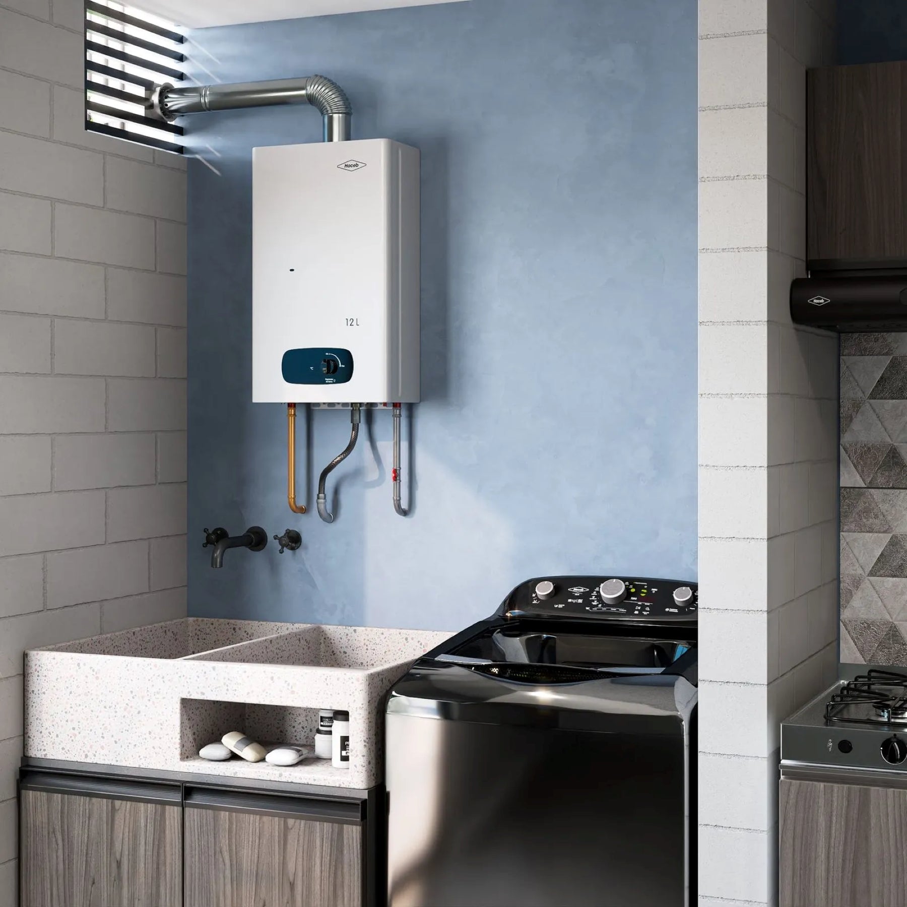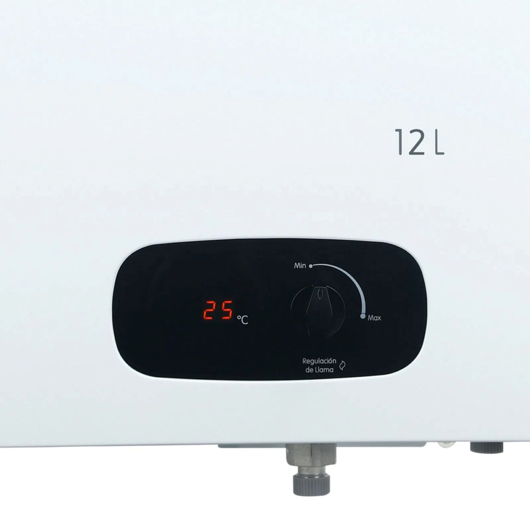 Calentador de agua, paso a gas natural, capacidad de 12 Lts por minuto, tiro forzado, temperatura regulable y Display indicador para visualizar la temperatura de salida del agua e información de funcionamiento. Operación automática, perillas de fácil manejo para controlar la temperatura del agua y el ahorro del gas, además cuenta con visor de llama para observar el funcionamiento del quemador. Vive tranquilo, nosotros te protegemos con nuestro sistema de seguridad, controla el tiempo de tus baños, temporizador que apaga el calentador luego de 20 minutos de uso continuo. Incluye ducto de evacuación y requiere toma eléctrica con polo a tierra, el ducto puede ir directo al exterior.