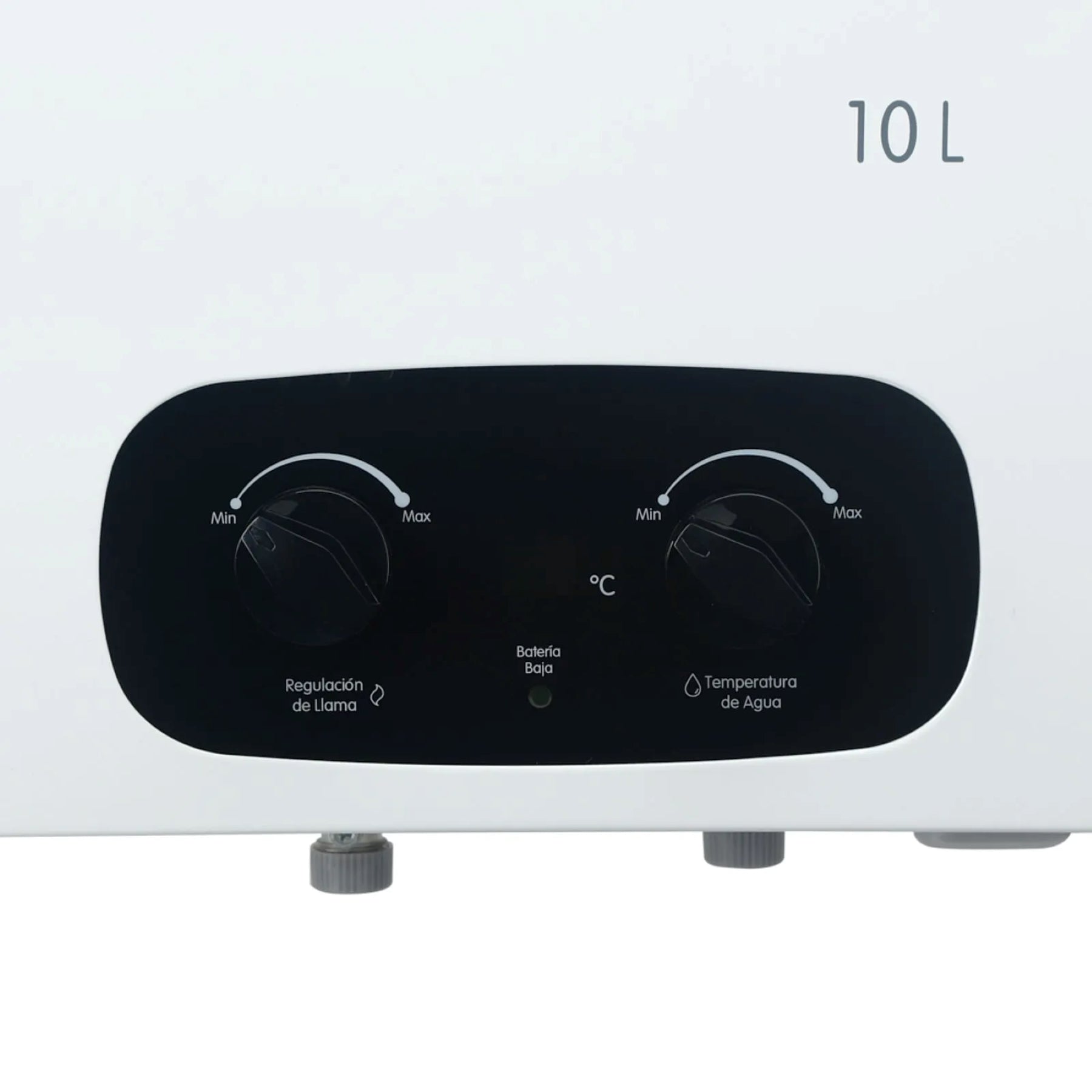 Calentador de agua, paso a gas natural, capacidad de 10 Lts por minuto, tiro natural, temperatura regulable y Display indicador para visualizar la temperatura de salida del agua e información de funcionamiento. Perillas de fácil manejo para controlar la temperatura del agua y el ahorro del gas, además cuenta con visor de llama para observar el funcionamiento del quemador, sistema de seguridad y temporizador que apaga el calentador luego de 20 minutos de uso continuo. Requiere ducto de evacuación y baterías.