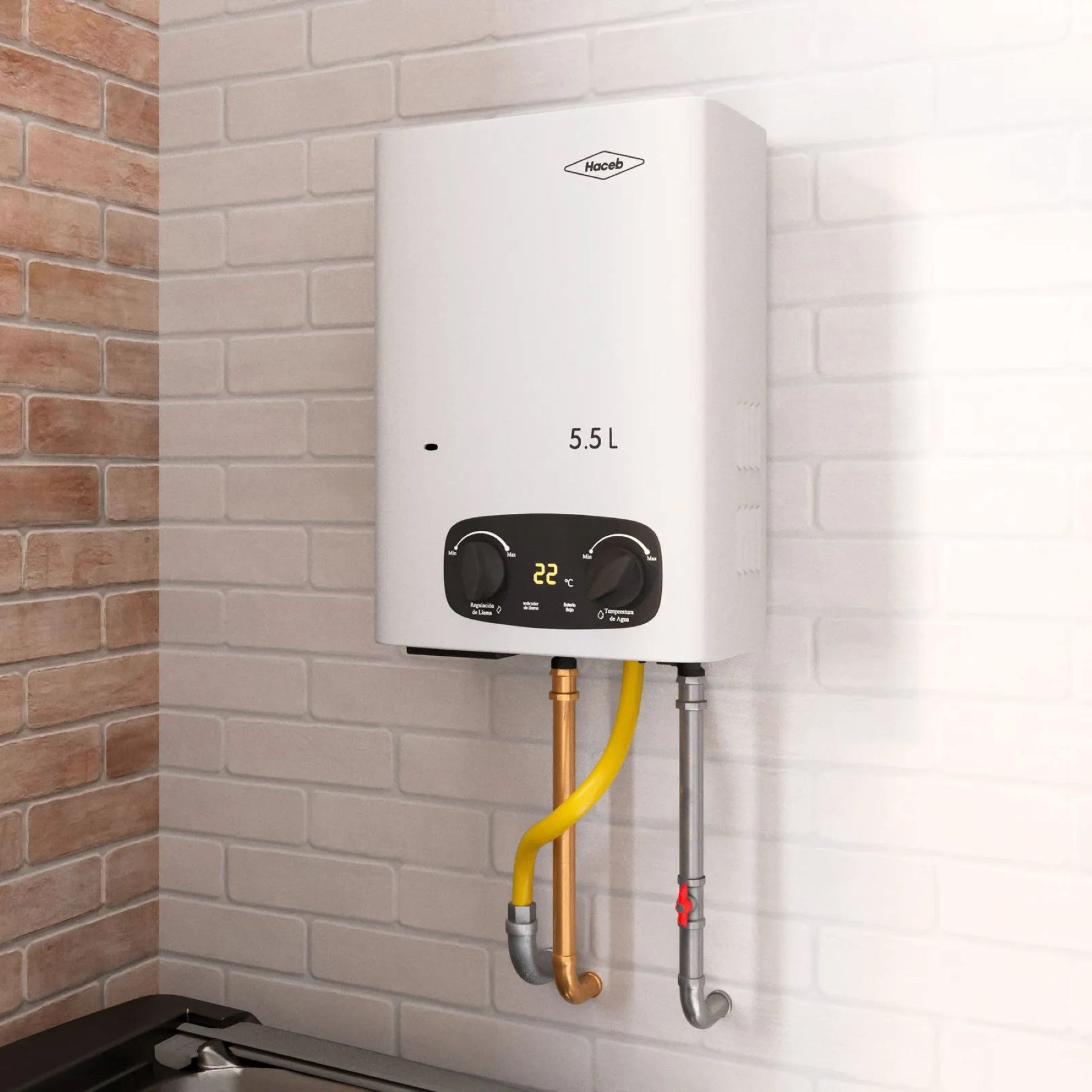 Calentador de agua, paso a gas natural, capacidad de 5,5 Lts por minuto, tiro natural, temperatura regulable y Display indicador para visualizar la temperatura de salida del agua e información de funcionamiento. Operación automática, no requiere ducto de evacuación, perillas de fácil manejo para controlar la temperatura del agua y el ahorro del gas, además cuenta con visor de llama para observar el funcionamiento del quemador, sistema de seguridad y temporizador que apaga el calentador luego de 20 minutos de uso continuo.
