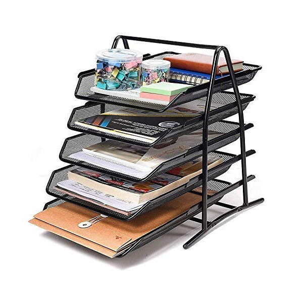 Practica bandeja organizadora de 5 niveles metálica de malla ideal para organizar todos tus documentos de oficina y personales. Se puede adaptar a cualquier tipo de escritorio o mesa de noche, en cualquier ambiente de tu hogar u oficina