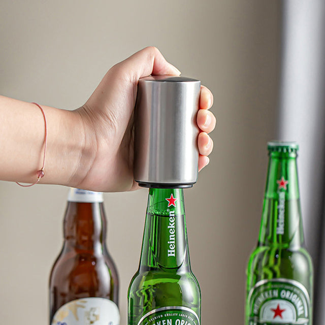 Práctico y rápido destapador de botellas magnético automático en acero inoxidable. Este abridor de botellas automático es el regalo perfecto para un amante de la cerveza, un barman aficionado, un entusiasta de la cerveza artesanal o un coleccionista de tapas de botellas. Elimina fácilmente la tapa de la botella sin abolladuras ni peligros de que las botellas de vidrio se quiebren