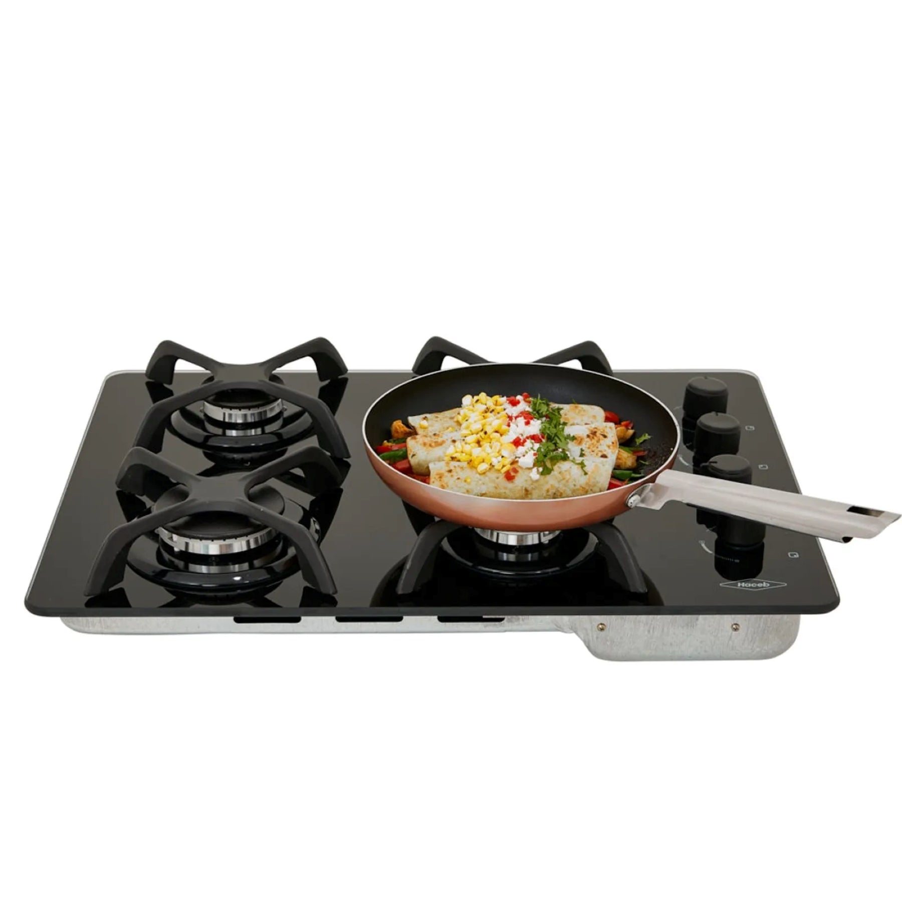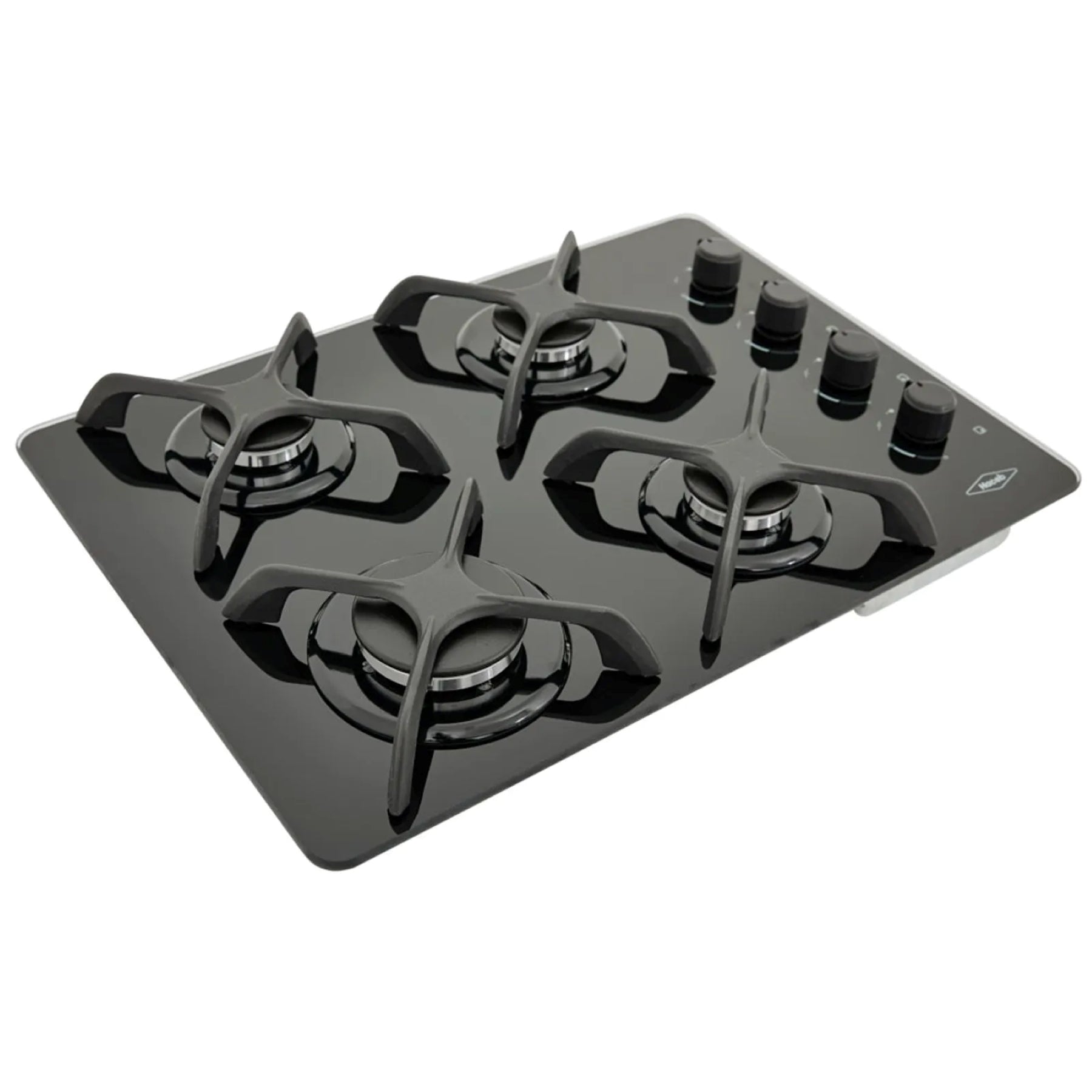 Estufa de empotrar a gas en Cristal negro de 60 cm de ancho, con un vidrio de 8mm de espesor que aporta robustez y seguridad. Cuenta con 4 fogones en diferentes tamaños que se acomodan a los diámetros de tus ollas y pesos de tus preparaciones y 1 fogón rápido 35% más potente que agiliza los tiempos de cocción . Parrillas en hierro fundido para más estabilidad y seguridad. Es de muy fácil limpieza gracias a sus perillas removibles. Enciende solo con girar la perilla.