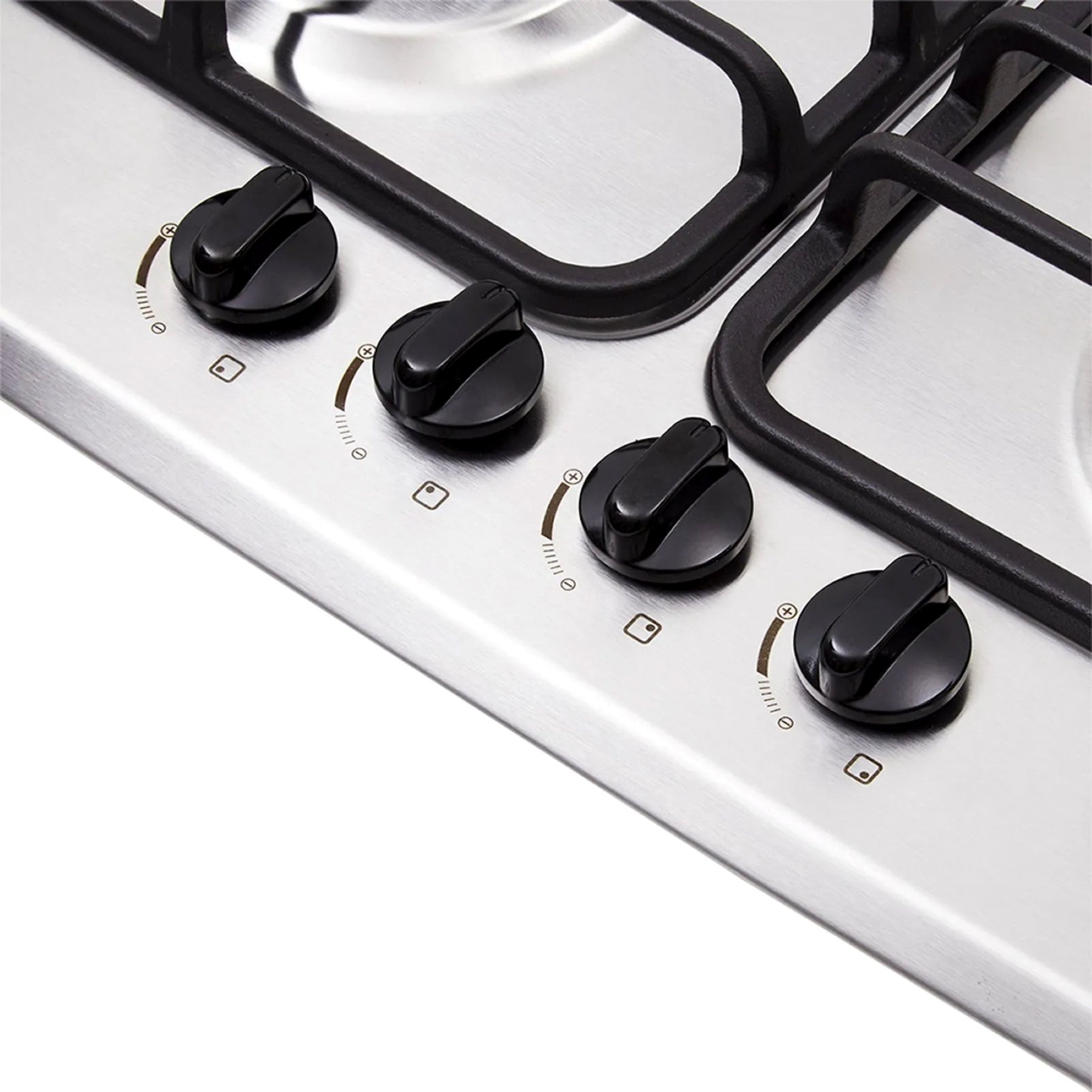 Estufa de empotrar a gas en acero inoxidable de 60 cm de ancho. Cuenta con 4 fogones en diferentes tamaños que se acomodan a los diámetros de tus ollas y pesos de tus preparaciones. Parrillas en hierro fundido con 6 puntos de apoyo para más estabilidad y seguridad y aro wok ideal para cocinar en recipientes especiales. Es de muy fácil limpieza gracias a la zona de encharque que recoge los derrames de líquido y a las perillas removibles. Enciende solo con girar las perillas.