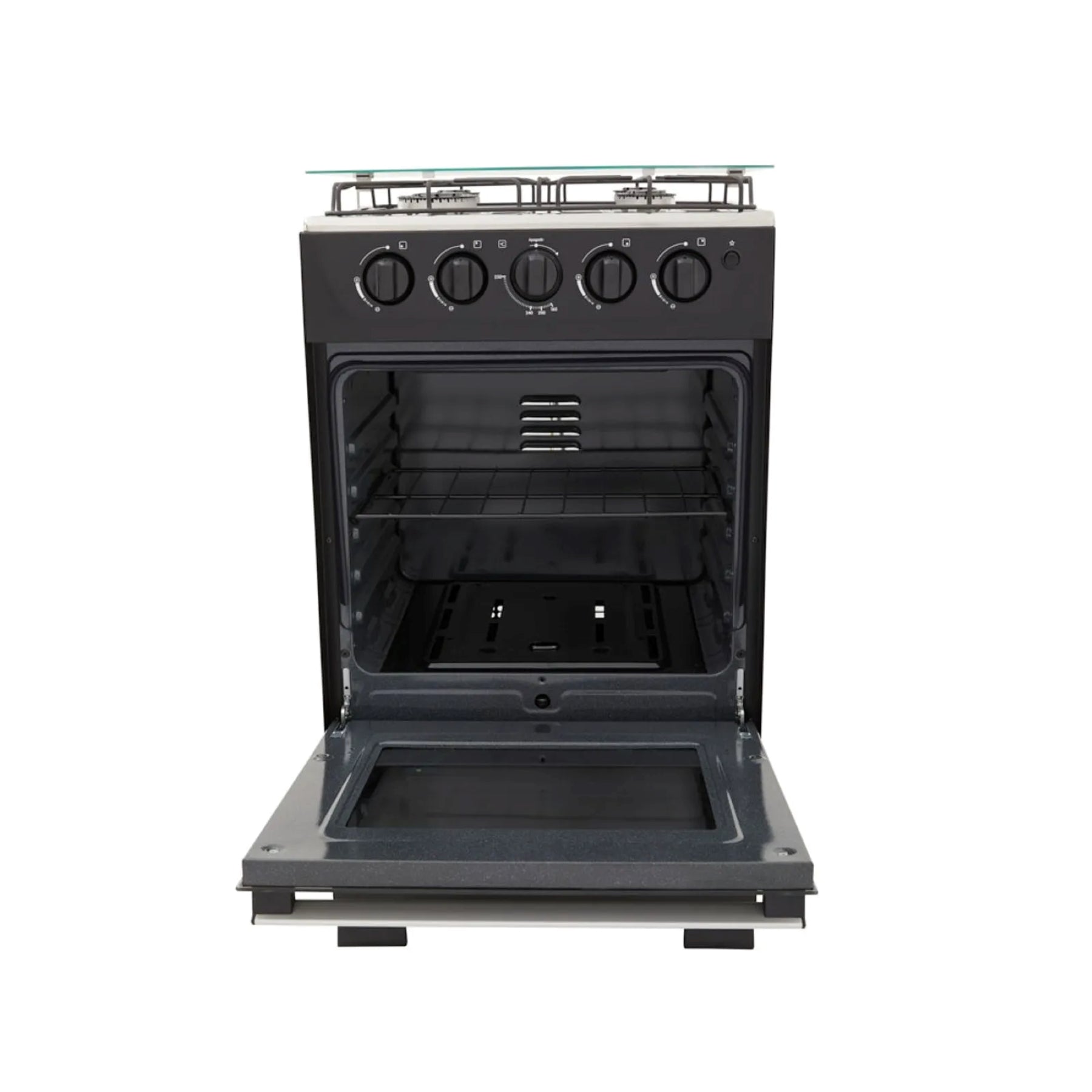 Estufa Haceb de 50 cms de ancho con mesa en acero inoxidable de gran durabilidad, fácil limpieza, parrilla antideslizante, resistencia al calor y elegancia. Cuenta con quemadores de diferentes tamaños, encendido eléctrico, vidrio superior templado para proteger de salpicaduras y soportes inferiores robustos para que cocines con tranquilidad y dejes todo impecable como te gusta. ¡El horno tiene visor amplio para hacerle seguimiento a tus recetas!