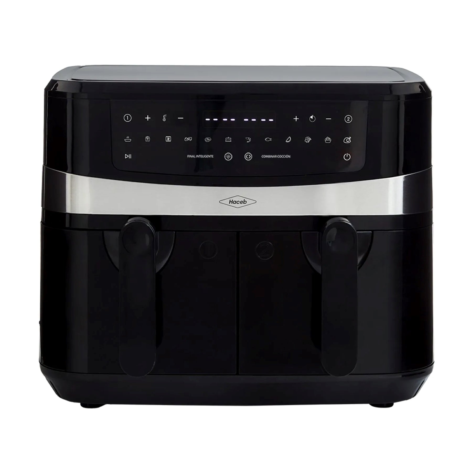 Doble capacidad para recetas más grandes, en simultáneo y sin necesidad de usar aceite con la freidora Haceb doble canasta. Tiene capacidad de 8 litros, control de tiempo y temperatura en el panel digital y sorpréndete con los 12 programas predeterminados para disfrutar de las recetas más exquisitas. Material antiadherente para su fácil limpieza y el diseño con acabados inox que adornarán tu cocina.