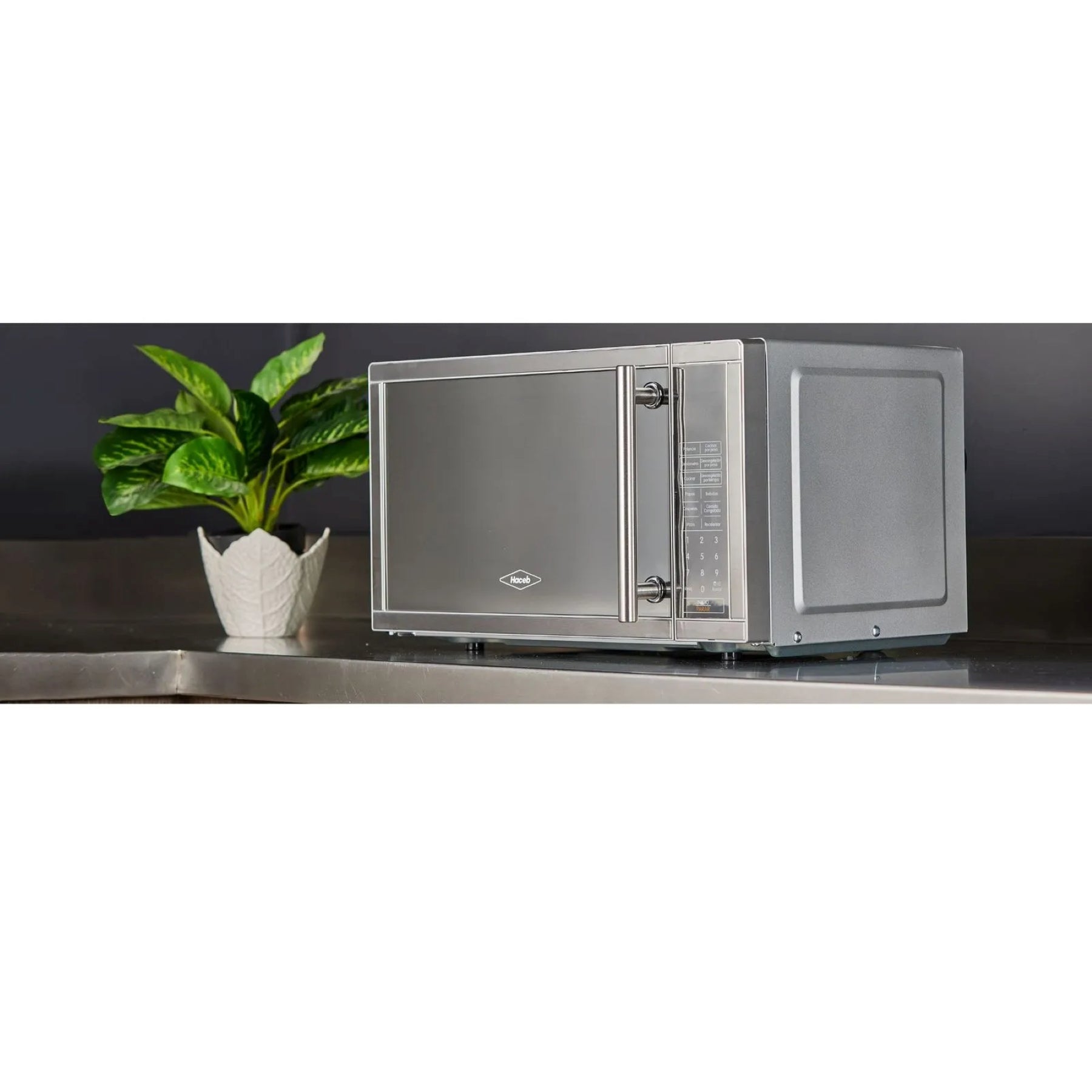 *6 funciones rápidas, bloqueo para niños, reloj potencia, cronometro, cocinar automático, cocinar por peso, descongelar por tiempo y peso.   Microondas en acero inoxidable de 20 litros con vidrio reflectivo y manija integrada que complementan su diseño. Con su función multietapa puedes programar en un solo instante descongelar y cocinar tus alimentos por un tiempo determinado. Además sus funciones predeterminadas agilizan la preparación de tus recetas favoritas.