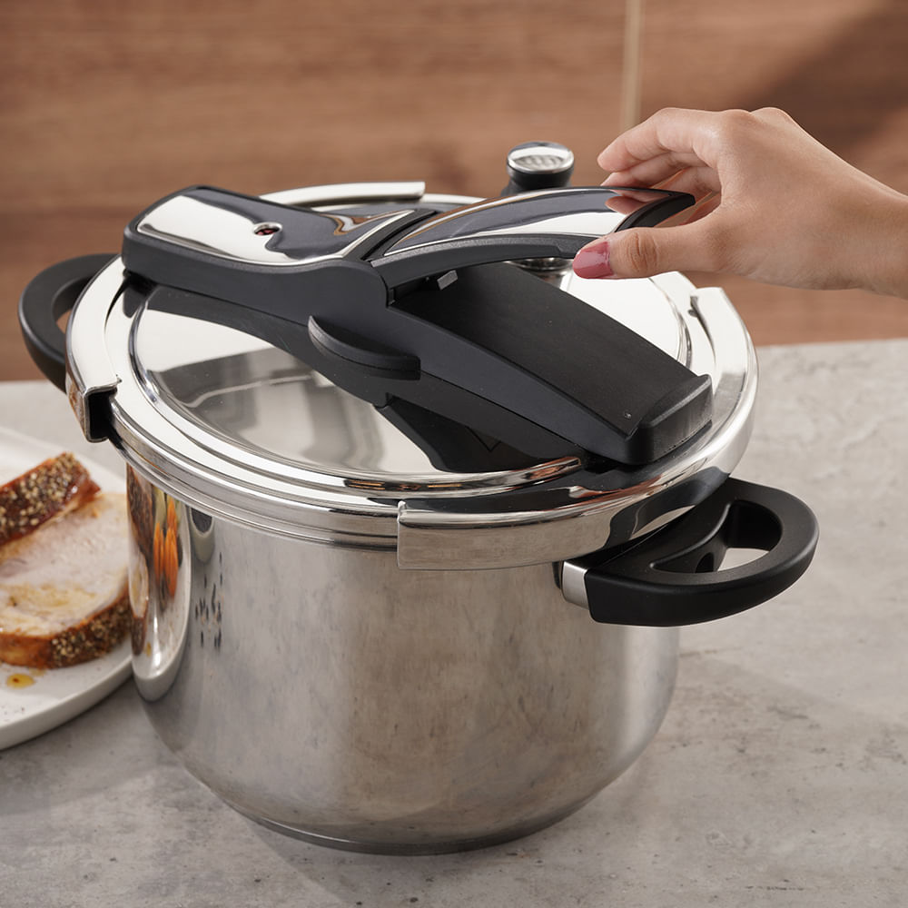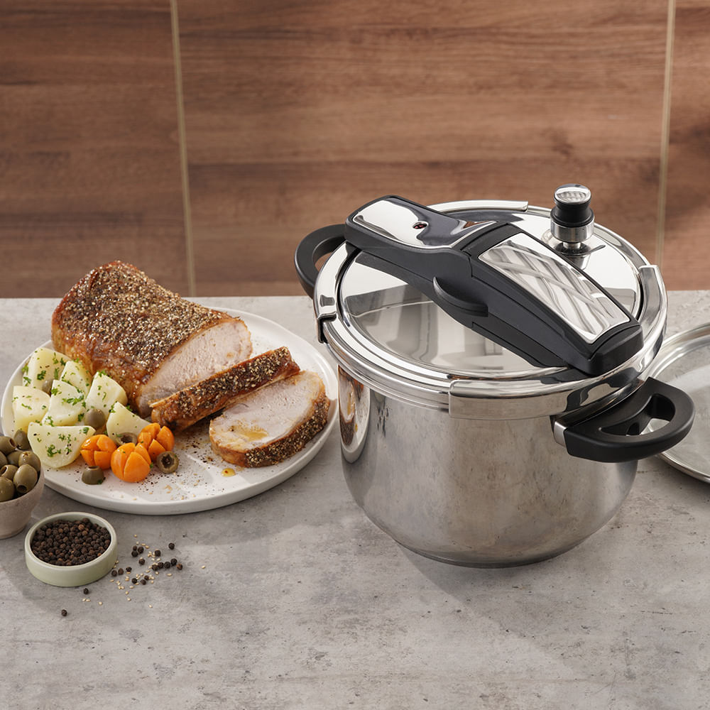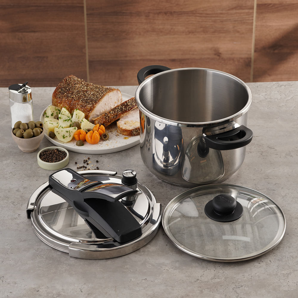 La Olla a Presión EXPERT UNIVERSAL de 6 litros está fabricada en acero inoxidable y cuenta con un cierre externo y cinco sistemas de seguridad. Ofrece una presión de operación de 80 kPa y viene con una tapa de vidrio adicional. Respaldada por una garantía de 25 años, es ideal para cocinar de manera rápida y segura