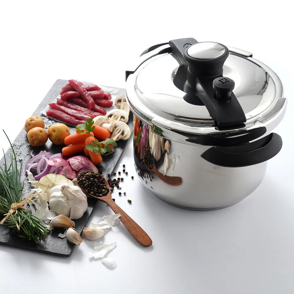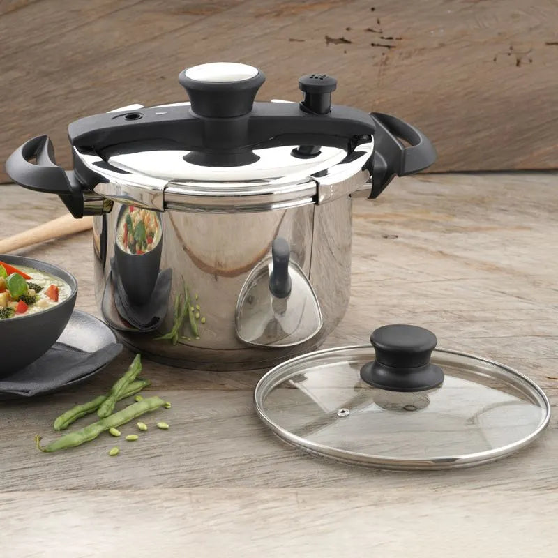 ¿QUIERES SORPRENDER A TU FAMILIA CON PLATOS EXQUISITOS?, Con la olla a presión Easy Click de 6 litros podrás tener tus mejores y más deliciosas recetas listas en cuestión de minutos. Se trata de un producto fundamental en cualquier cocina, que te asegura resultados efectivos en cada uso. Nuestra olla está fabricada en acero inoxidable de alta calidad, garantizando durabilidad y resistencia. Su diseño robusto lo complementa un par de asas en baquelita para ofrecerte un agarre súper cómodo. Además, su tapa de vidrio te permite monitorear el proceso de cocción sin necesidad de levantarla, manteniendo el calor y los aromas en las mejores condiciones. Esta olla puede operar a 100 kPa gracias a su disco difusor, el cual proporciona una distribución uniforme del calor a cada ingrediente. Sin duda, se trata de un implemento de cocina que mejorará tus días. ¡Pídelo en línea!