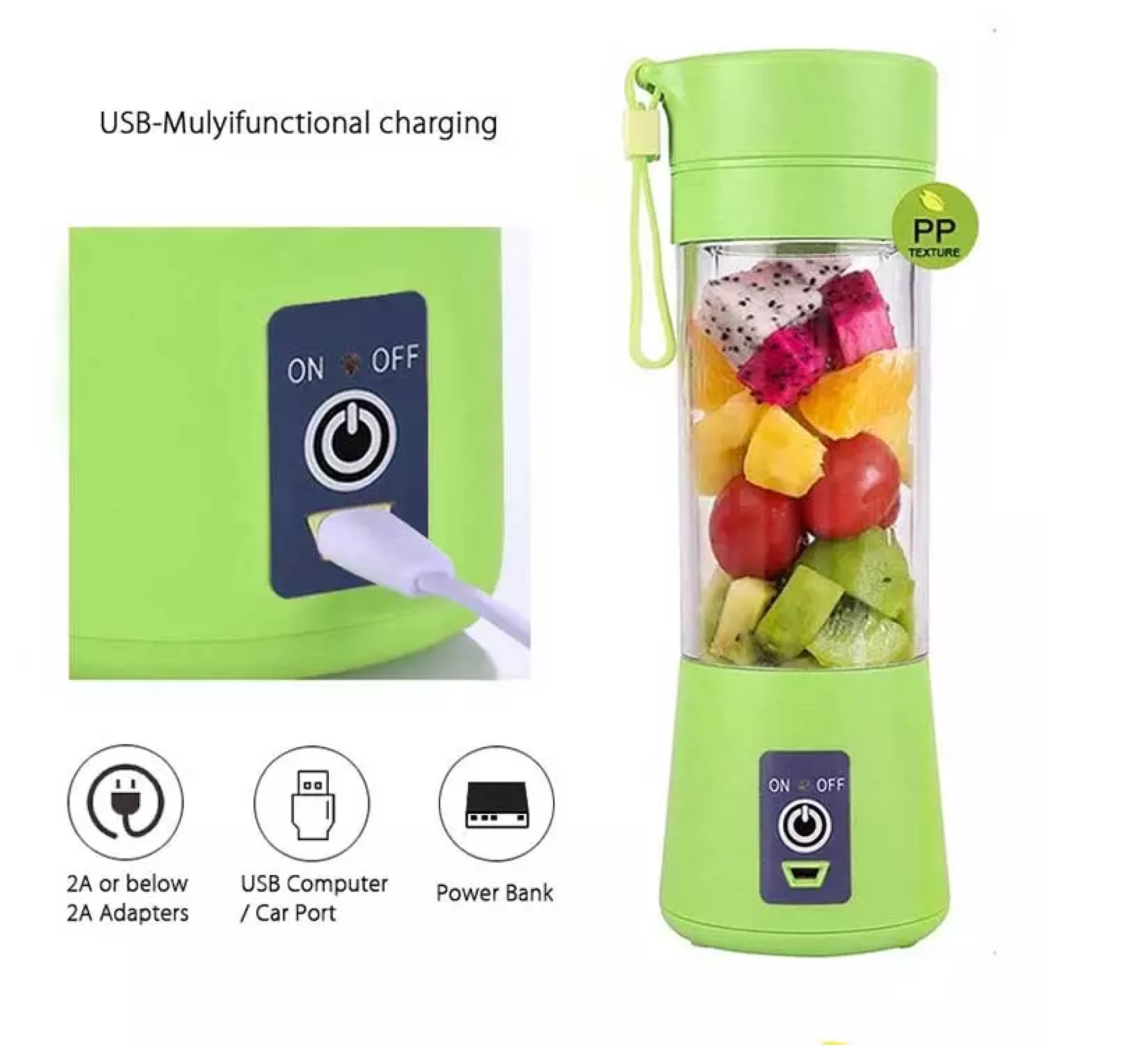 - Medidas: 23,4 cm x 8 cm de diámetro - Capacidad 12 oZ - Material: de plástico y acero inoxidable - Volumen: 380 Ml - Batería: 2000 mAh 3,7 V - Velocidad sin carga del Motor: <22000 RPM ± 15% - Velocidad de carga del Motor: <15000 RPM ± 15% - Tiempo de recarga completo: alrededor de 3 horas - Uso de 10 a 12 tazas de jugo. - Cuenta con seguridad de interruptor. - Velocidad rápida, puede hacer una taza de jugo en 1 minuto. - Puede ser cargado por el Banco de potencia, ordenador portátil, ordenador, teléfonos móviles u otros dispositivos USB. - Ideal para viajar, compras y deportes fuera.