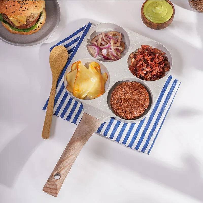 Antójate con nuestra nueva sartén múltiple. Ahorra tiempo y diviértete en el proceso de cocinar en sus 4 puestos. El sartén múltiple tiene doble capa antihaderente de alta tecnología que resiste hasta 20.000 mil ciclos de abrasión, con lo que obtendrás un producto de larga duración y máximo desempeño donde ningún alimento se le pega; cuenta con un mango de baquelita tipo madera que brinda mayor seguridad y suavidad al tacto.
